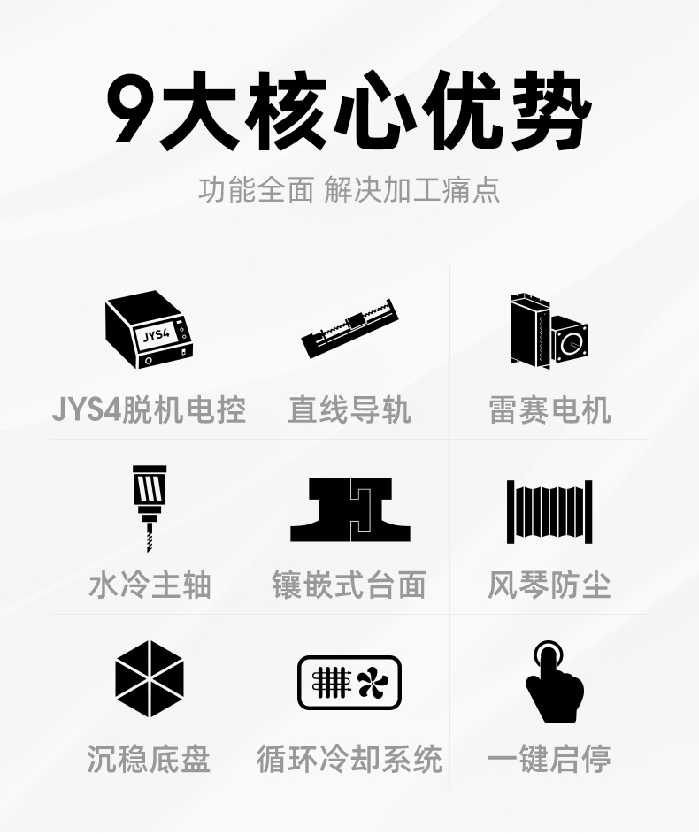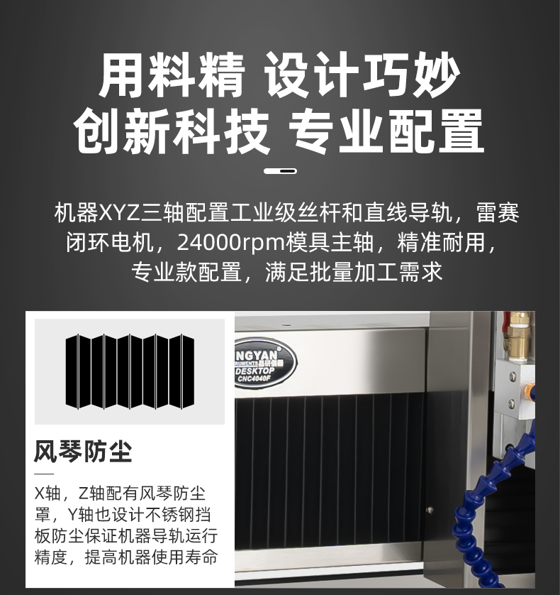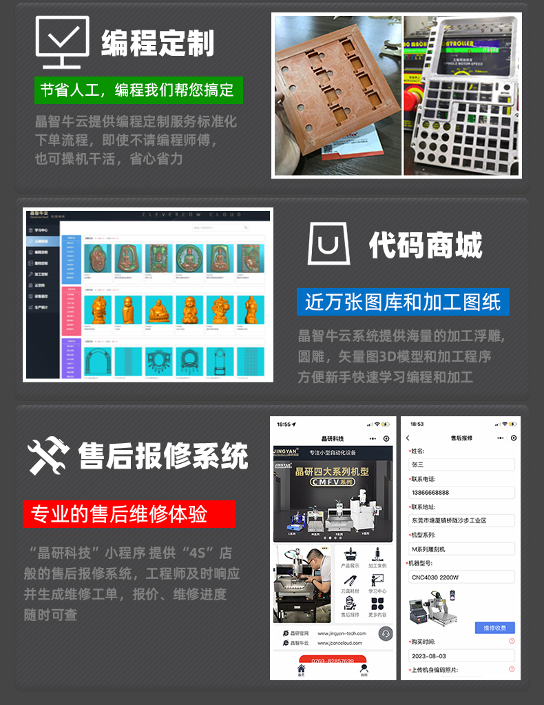 晶研方軌精雕機(jī)是一款高精度、高穩(wěn)定性的數(shù)控雕刻設(shè)備,適用于多種材料和加工需求。它配備了工業(yè)級絲桿、直線導(dǎo)軌和雷賽閉環(huán)電機(jī),確保了加工的精度和耐用性。此外,它還具有風(fēng)琴防塵設(shè)計、手動注油系統(tǒng)、沉穩(wěn)底盤和高柔拖鏈線,提高了機(jī)器的使用壽命和運(yùn)行穩(wěn)定性。該設(shè)備提供多種控制系統(tǒng)選擇,包括JYS4脫機(jī)電控系統(tǒng)、伺服+JYS4專業(yè)版脫機(jī)系統(tǒng)和Mach3控制系統(tǒng),以滿足不同的生產(chǎn)需求。晶研方軌精雕機(jī)的桌面款設(shè)計使其占地面積小,適合在有限空間內(nèi)使用,是一款適合工廠批量生產(chǎn)和自動化加工的高效設(shè)備。