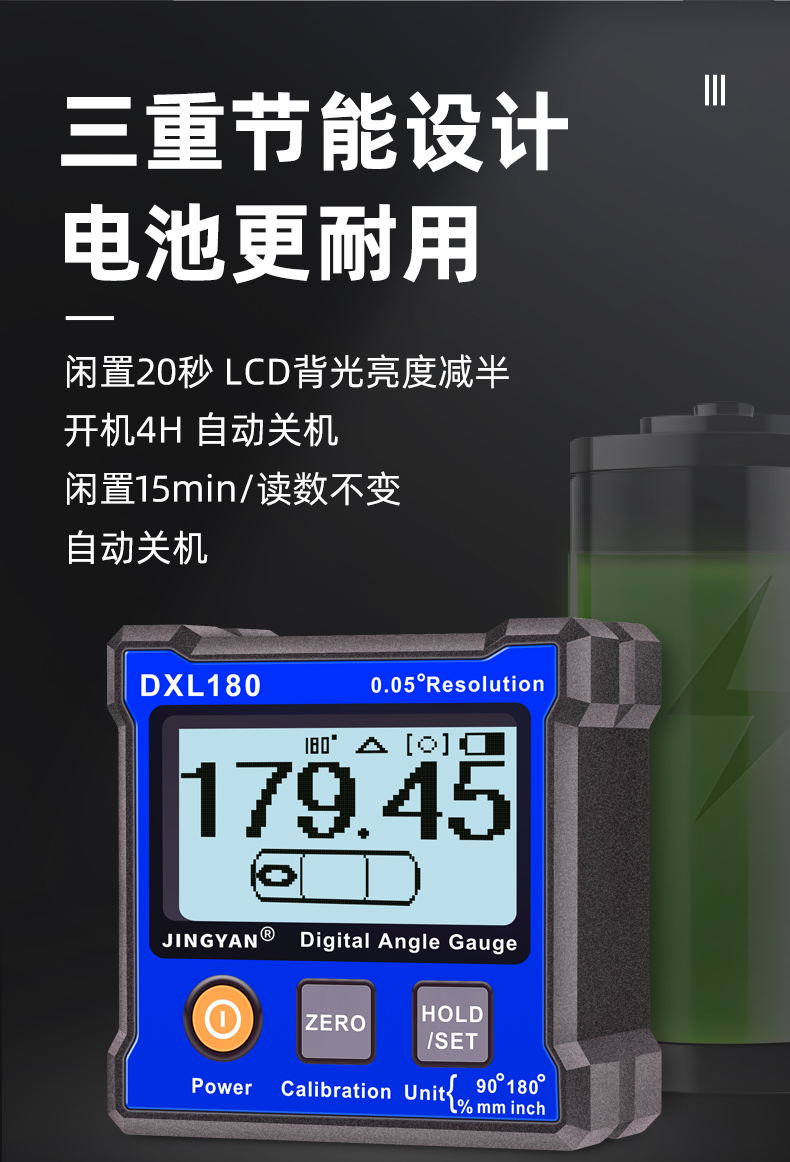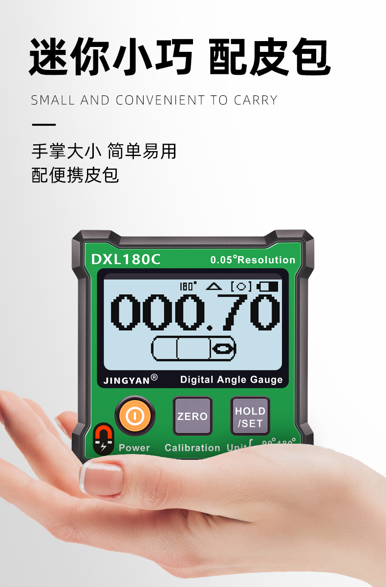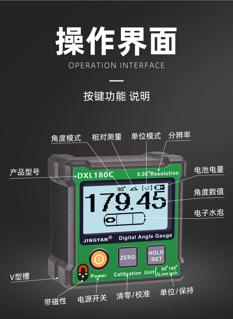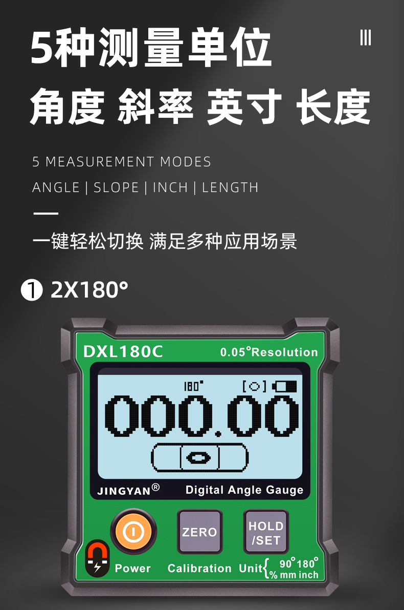DXL180/C是一款可以使用多種單位顯示的數(shù)字角度儀,支持單位為角度、斜率、英寸和毫米/米的讀數(shù)。測(cè)量范圍為2*0-180°和4*0-90°,儀器底部測(cè)量面具有強(qiáng)力磁性。V形凹槽設(shè)計(jì)便于放置在圓形管上進(jìn)行測(cè)量。支持IP42等級(jí)防塵防水,背面預(yù)留M4螺絲孔,方便安裝固定。DXL180/C廣泛應(yīng)用于木工切割、機(jī)械制造、裝修設(shè)計(jì)、攝影愛(ài)好、產(chǎn)品檢測(cè)等領(lǐng)域。