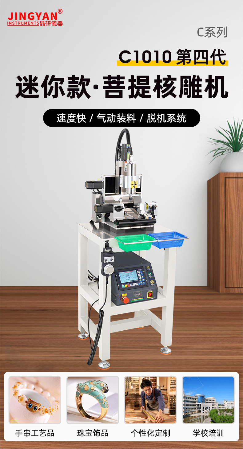 晶研儀器C1010第三代迷你款·菩提核雕機(jī),專為手串工藝品和珠寶飾品設(shè)計(jì)。該設(shè)備具備兩種系統(tǒng)選擇:MACH 3 電控系統(tǒng)和JYS4脫機(jī)電控系統(tǒng),滿足不同加工需求。其九大核心特性包括專業(yè)系統(tǒng)、四軸聯(lián)動(dòng)、高速加工等,確保加工效率和精度。四大性能升級(jí),如智能計(jì)件、快速上料、高速運(yùn)行和節(jié)能省電,進(jìn)一步提升操作便捷性和經(jīng)濟(jì)效益。設(shè)備適用于多種材料加工,如菩提手串、橄欖核雕等,是個(gè)性化定制和批量生產(chǎn)的理想選擇。