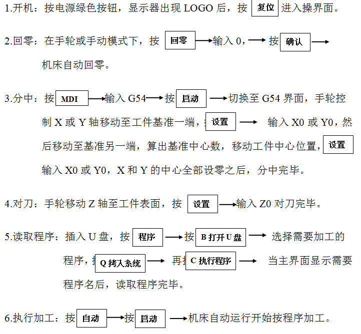 對刀操作是由Z軸至加工件表面,進(jìn)行設(shè)置輸入Z0進(jìn)行對刀完畢。數(shù)控系統(tǒng)的編程與程序設(shè)置需先插入U(xiǎn)盤,按‘程序’按鈕,進(jìn)出界面選擇‘B打開U盤’的時(shí)候,選擇需要加工的程序,按‘Q拷入系統(tǒng)’在界面上按‘C執(zhí)行程序’,當(dāng)主界面顯示需要的程序名后,讀取程序完畢。